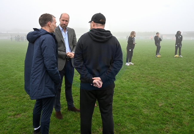 Prince William, Prince of Wales, Duke of Cornwall speaks with players and staff to hear about the difference the new road has made during his visit to Mousehole AFC, where he opened a new access road to the club's ground and facilities on November 13, 2025 in Mousehole, England., Credit:Avalon.red / Avalon