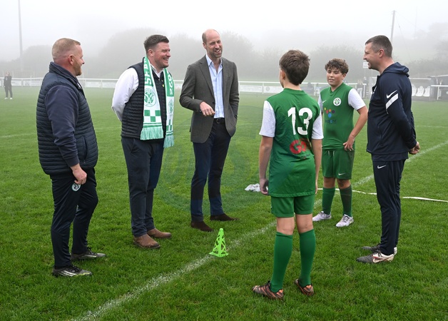 Prince William, Prince of Wales, Duke of Cornwall laughs as he speaks with players from the youth team taking part in training during his visit to Mousehole AFC, where he opened a new access road to the club's ground and facilities on November 13, 2025 in Mousehole, England., Credit:Avalon.red / Avalon
