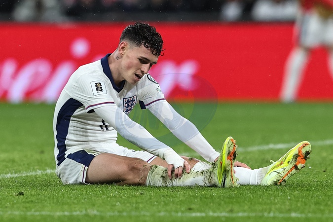 Phil Foden of England takes a knock during the FIFA World Cup Qualifiers round 9 match England vs Serbia at Wembley Stadium, London, United Kingdom, 13th November 2025, Credit:Ae Cosgrove/News Images / Avalon