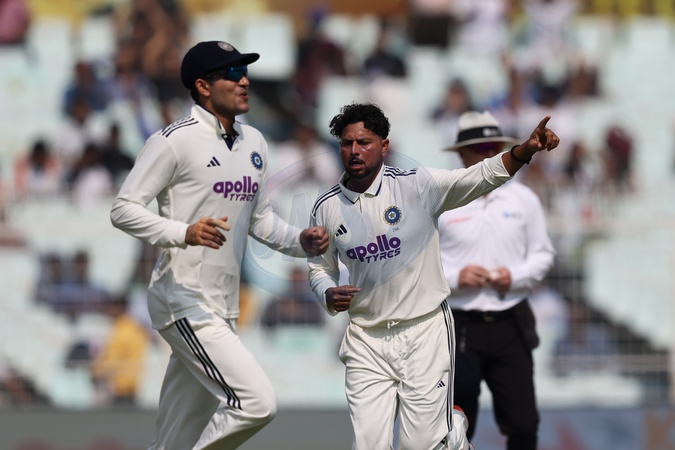 Kuldeep Yadav baller of India celebrates wicke of Teamba Bavuma (Captain) Of South Africa with Shubman Gill (Captain) of India during the IDFC First Bank Test match day 1 India vs South Africa at Eden Gardens, Kolkata, India, 14th November 2025, Credit:Shubhajit Roy Karmakar/News Images / Avalon