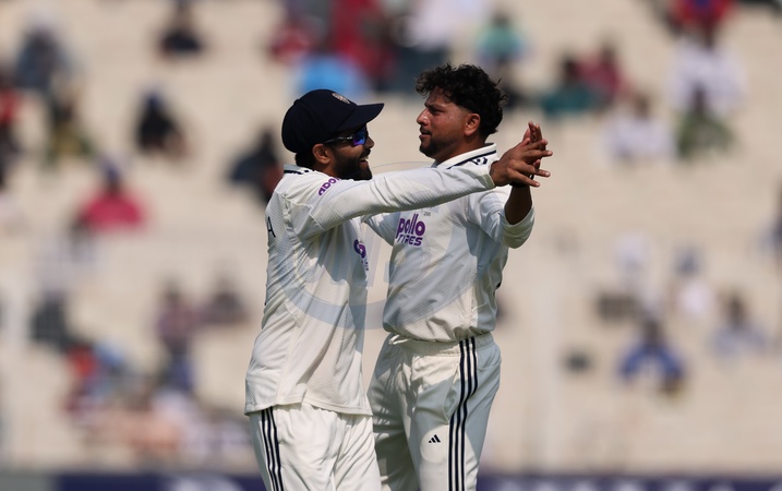 Kuldeep Yadav baller of India celebrates wicke of Teamba Bavuma (Captain) Of South Africa with Ravindra Jadeja of India during the IDFC First Bank Test match day 1 India vs South Africa at Eden Gardens, Kolkata, India, 14th November 2025, Credit:Shubhajit Roy Karmakar/News Images / Avalon