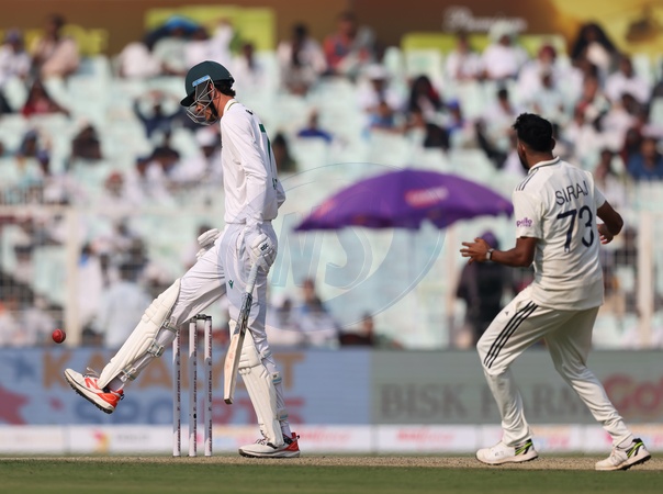 Marco Jansen Of South Africa removes the ball by kicking it Mohammed Siraj of India during the IDFC First Bank Test match day 1 India vs South Africa at Eden Gardens, Kolkata, India, 14th November 2025, Credit:Shubhajit Roy Karmakar/News Images / Avalon