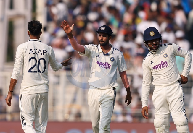 Axar Patel of India takes wicket of Corbin Bosch Of South Africa and celebrates with Dhruv Jurel of India during the IDFC First Bank Test match day 1 India vs South Africa at Eden Gardens, Kolkata, India, 14th November 2025, Credit:Shubhajit Roy Karmakar/News Images / Avalon
