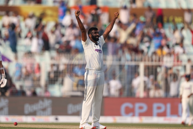 Jasprit Bumrah of India took wicket of Keshav Maharaj Of South Africa and celebrates during the IDFC First Bank Test match day 1 India vs South Africa at Eden Gardens, Kolkata, India, 14th November 2025, Credit:Shubhajit Roy Karmakar/News Images / Avalon