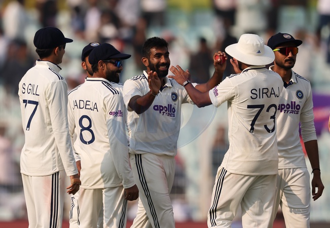 Jasprit Bumrah of India took wicket of Keshav Maharaj Of South Africa and celebrates with Mohammed Siraj of India , Shubman Gill (Captain) of India and Ravindra Jadeja of India during the IDFC First Bank Test match day 1 India vs South Africa at Eden Gardens, Kolkata, India, 14th November 2025, Credit:Shubhajit Roy Karmakar/News Images / Avalon