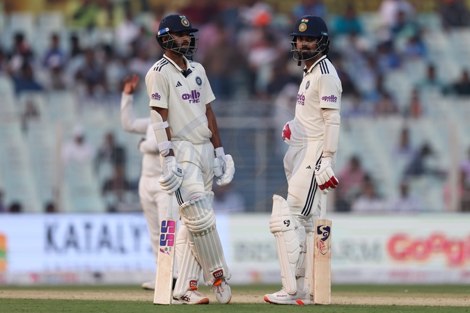 Washington Sundar of India and KL Rahul of India during the IDFC First Bank Test match day 1 India vs South Africa at Eden Gardens, Kolkata, India, 14th November 2025, Credit:Shubhajit Roy Karmakar/News Images / Avalon