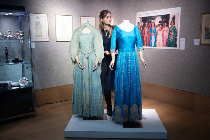 A staff member views (L) - a silk ballgown designed for Lady Glenconner for the Peacock Ball by Carl Toms (est. £500 £800) and (R) - a hand made turquoise silk Indian gown worn by Lady Glenconner at the Peacock ball by Carl Toms (est. £500 - £800) which is part of Bonhams 'Lady Glenconner, My Life in Objects' Sale on sale on 18 November 2025 - Bonhams, London, England, UK on Friday 14 November, 2025., Credit:Justin Ng / Avalon
