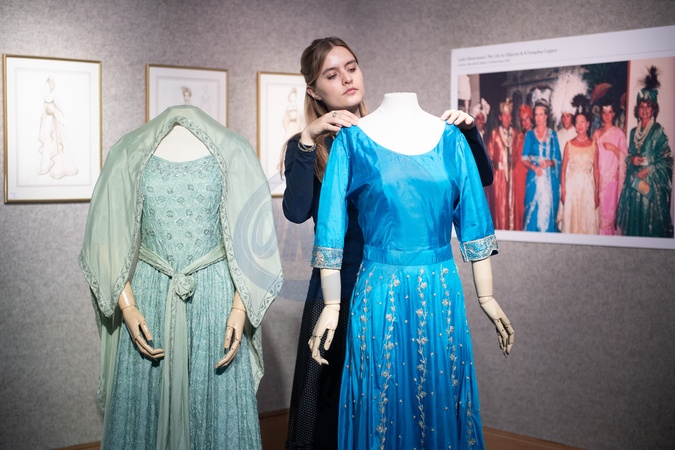 A staff member views (L) - a silk ballgown designed for Lady Glenconner for the Peacock Ball by Carl Toms (est. £500 £800) and (R) - a hand made turquoise silk Indian gown worn by Lady Glenconner at the Peacock ball by Carl Toms (est. £500 - £800) which is part of Bonhams 'Lady Glenconner, My Life in Objects' Sale on sale on 18 November 2025 - Bonhams, London, England, UK on Friday 14 November, 2025., Credit:Justin Ng / Avalon