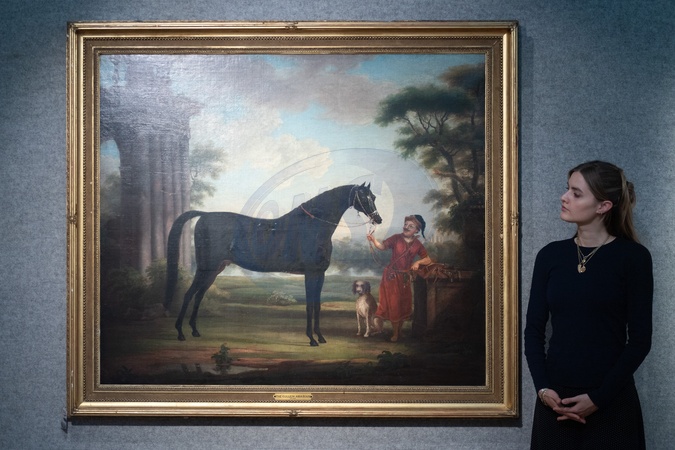 A staff member views 'The Cullen Arabian held by a groom, before a landscape with classical ruins' by Thomas Smith of Derby (est. £50k - £70k) which is part of Bonhams 'Lady Glenconner, My Life in Objects' Sale on sale on 18 November 2025 - Bonhams, London, England, UK on Friday 14 November, 2025., Credit:Justin Ng / Avalon