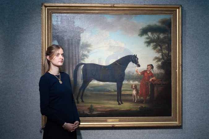 A staff member views 'The Cullen Arabian held by a groom, before a landscape with classical ruins' by Thomas Smith of Derby (est. £50k - £70k) which is part of Bonhams 'Lady Glenconner, My Life in Objects' Sale on sale on 18 November 2025 - Bonhams, London, England, UK on Friday 14 November, 2025., Credit:Justin Ng / Avalon