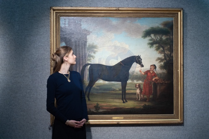 A staff member views 'The Cullen Arabian held by a groom, before a landscape with classical ruins' by Thomas Smith of Derby (est. £50k - £70k) which is part of Bonhams 'Lady Glenconner, My Life in Objects' Sale on sale on 18 November 2025 - Bonhams, London, England, UK on Friday 14 November, 2025., Credit:Justin Ng / Avalon
