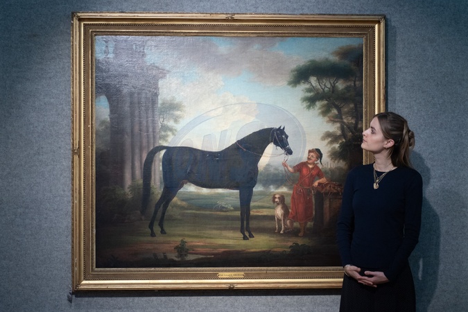 A staff member views 'The Cullen Arabian held by a groom, before a landscape with classical ruins' by Thomas Smith of Derby (est. £50k - £70k) which is part of Bonhams 'Lady Glenconner, My Life in Objects' Sale on sale on 18 November 2025 - Bonhams, London, England, UK on Friday 14 November, 2025., Credit:Justin Ng / Avalon