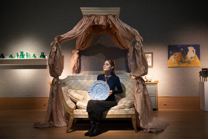 A staff member views (front) - A Chinese blue and white charger - Kangxi (est. £400 - £600) (sitting) - A Regency carved giltwood day bed - Early 19th century, in the manner of Marsh and Tatham (est. £600 - £1, 000), (behind) - A cream painted tester bed - 20th Century (est. £800 - £1, 200) which is part of Bonhams 'Lady Glenconner, My Life in Objects' Sale on sale on 18 November 2025 - Bonhams, London, England, UK on Friday 14 November, 2025., Credit:Justin Ng / Avalon