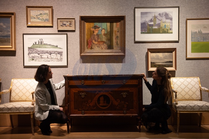 A staff member views 'An exceptional Lombard early 19th century purplewood, mahogany, rosewood, tulipwood, maple and marquetry commode by Giuseppe Maggiolini (1738-1814) ' - Circa 1805-1810, Parabiago (est. £50k - £80k) and (behind) - 'The Painting Lesson' by Victor Passmore (est. £30k - £50k) which is part of Bonhams 'Lady Glenconner, My Life in Objects' Sale on sale on 18 November 2025 - Bonhams, London, England, UK on Friday 14 November, 2025., Credit:Justin Ng / Avalon
