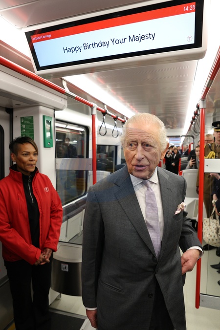 A birthday message is displayed on the screen as Britain's King Charles III travels on a Stadler Class 398 Tram during a visit to officially open the South Wales Metro Depot in the South Wales town of Taff's Well on November 14, 2025, as the king marks his 77th birthday., Credit:ADRIAN DENNIS / Avalon