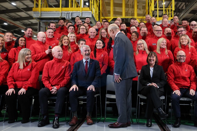 Britain's King Charles III joins employees and Britain's Wales Secretary Jo Stevens (centre right) for a group, Credit:ADRIAN DENNIS / Avalon