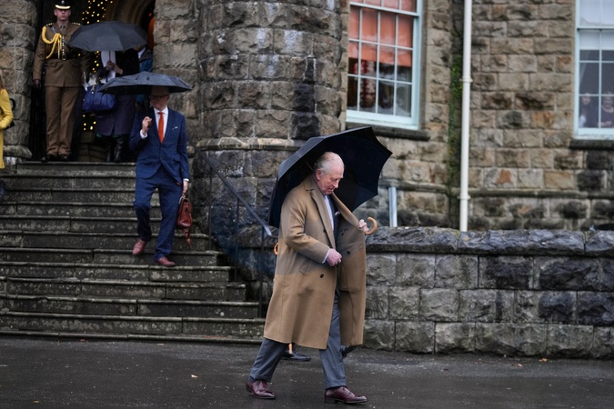 Britain's King Charles III closes his coat as he leaves after joining a celebratory reception marking Cyfarthfa Castle's 200th anniversary and the King's birthday in Merthyr Tydfil, Wales, Friday, Nov. 14, 2025., Credit:Kin Cheung / Avalon