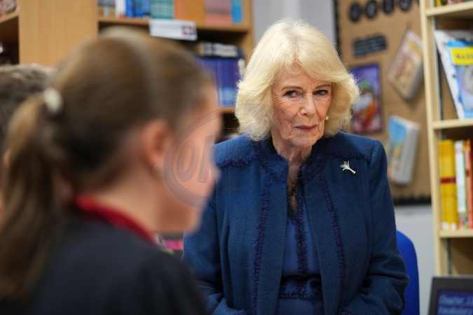 Britain's Queen Camilla listens to students as she visits Cyfarthfa Primary School to join pupils taking part in a guided reading programme and attends a school assembly in Merthyr Tydfil, Wales, Friday, Nov. 14, 2025., Credit:Kin Cheung / Avalon