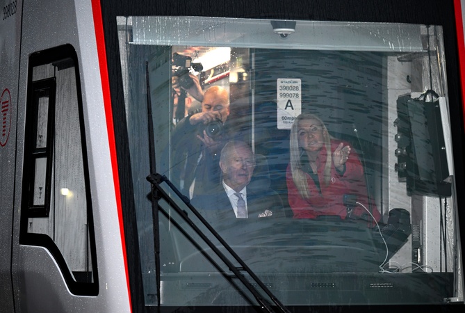 TAFF'S WELL, WALES - NOVEMBER 14: King Charles III takes the controls of a tram-train officially named Myddfai within the depot during a visit to Taff's Well Transport Depot on November 14, 2025 in Taff's Well, Wales. King Charles III and Queen Camilla are undertaking a series of engagements in South Wales today, as the monarch celebrates his 77th birthday., Credit:Finnbarr Webster / Avalon