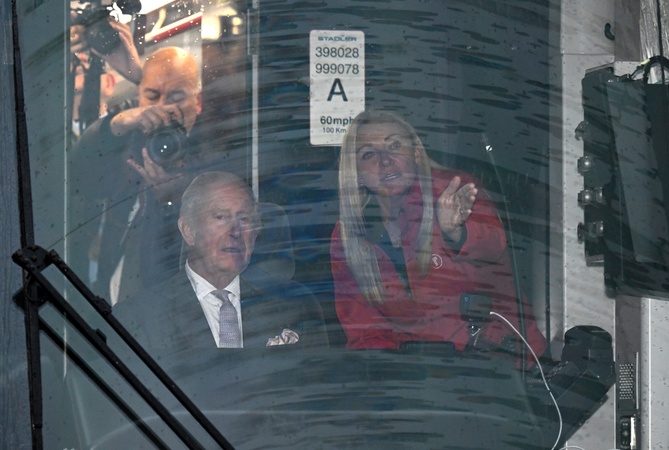 TAFF'S WELL, WALES - NOVEMBER 14: King Charles III takes the controls of a tram-train officially named Myddfai within the depot during a visit to Taff's Well Transport Depot on November 14, 2025 in Taff's Well, Wales. King Charles III and Queen Camilla are undertaking a series of engagements in South Wales today, as the monarch celebrates his 77th birthday., Credit:Finnbarr Webster / Avalon