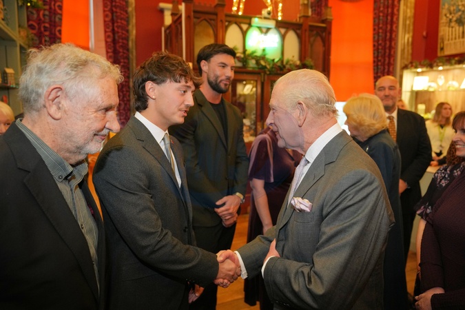 Britain's King Charles III shakes hands with Lewis Leigh as he joins a celebratory reception marking Cyfarthfa Castle's 200th anniversary and the King's birthday in Merthyr Tydfil, Wales, Friday, Nov. 14, 2025., Credit:Kin Cheung / Avalon