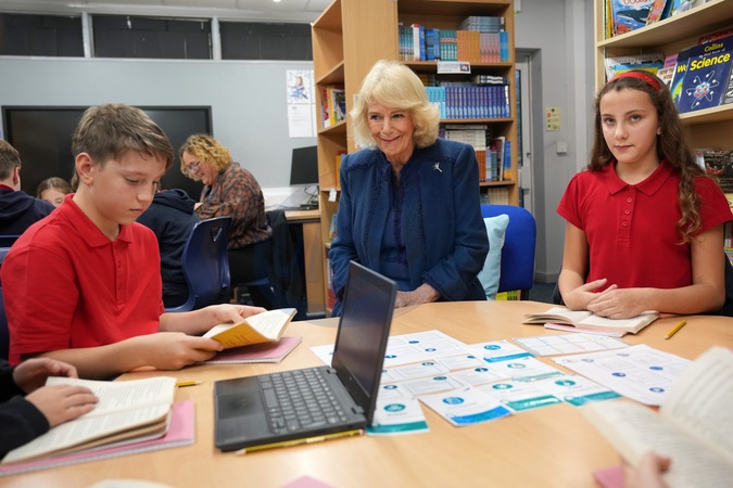 Britain's Queen Camilla listens to students as she visits Cyfarthfa Primary School to join pupils taking part in a guided reading programme and attends a school assembly in Merthyr Tydfil, Wales, Friday, Nov. 14, 2025., Credit:Kin Cheung / Avalon