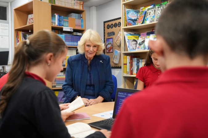 Britain's Queen Camilla listens to students as she visits Cyfarthfa Primary School to join pupils taking part in a guided reading programme and attends a school assembly in Merthyr Tydfil, Wales, Friday, Nov. 14, 2025., Credit:Kin Cheung / Avalon