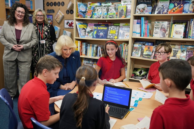 Britain's Queen Camilla listens to students as she visits Cyfarthfa Primary School to join pupils taking part in a guided reading programme and attends a school assembly in Merthyr Tydfil, Wales, Friday, Nov. 14, 2025., Credit:Kin Cheung / Avalon