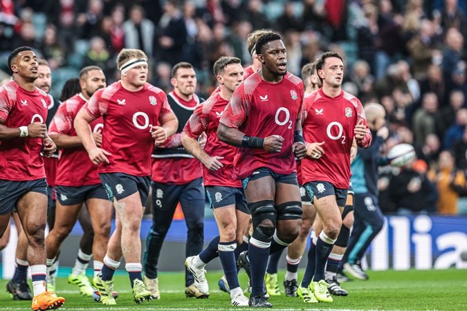 England players in the pre-game warm up during the Quilter Nations Series 2025 match England vs New Zealand at Allianz Stadium, Twickenham, United Kingdom, 15th November 2025, Credit:Mark Cosgrove/News Images / Avalon
