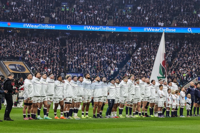 England stand for the National Anthem during the Quilter Nations Series 2025 match England vs New Zealand at Allianz Stadium, Twickenham, United Kingdom, 15th November 2025, Credit:Mark Cosgrove/News Images / Avalon