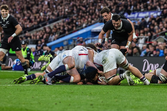 Leicester Fainga'anuku New Zealand goes over for a try during the Quilter Nations Series 2025 match England vs New Zealand at Allianz Stadium, Twickenham, United Kingdom, 15th November 2025, Credit:Mark Cosgrove/News Images / Avalon