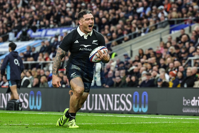 Codie Taylor of New Zealand celebrates his try during the Quilter Nations Series 2025 match England vs New Zealand at Allianz Stadium, Twickenham, United Kingdom, 15th November 2025, Credit:Mark Cosgrove/News Images / Avalon