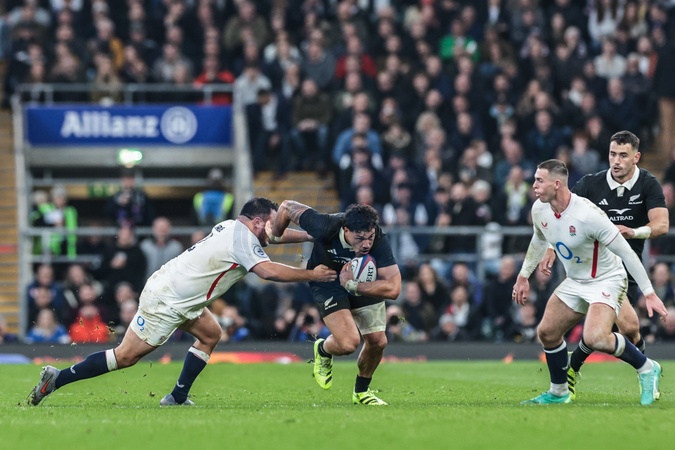 Billy Proctor of New Zealand is tackled by Mario Itoje of England during the Quilter Nations Series 2025 match England vs New Zealand at Allianz Stadium, Twickenham, United Kingdom, 15th November 2025, Credit:Mark Cosgrove/News Images / Avalon