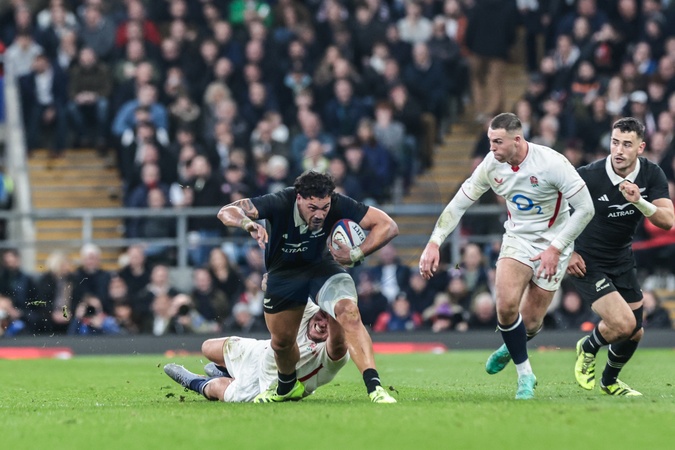 Billy Proctor of New Zealand is tackled by Mario Itoje of England during the Quilter Nations Series 2025 match England vs New Zealand at Allianz Stadium, Twickenham, United Kingdom, 15th November 2025, Credit:Mark Cosgrove/News Images / Avalon