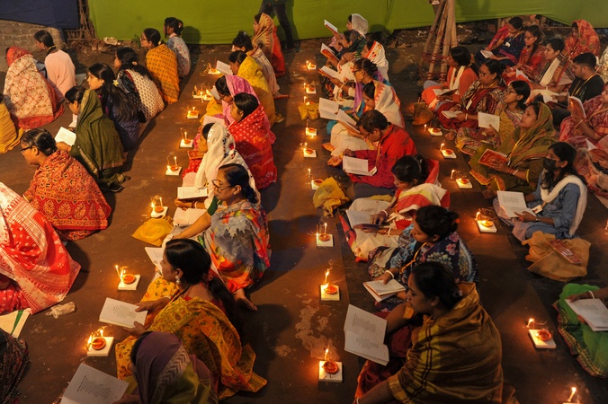 Chattogram, Bangladesh: Hindu devotees light candles and pray at the Shri Shri Lokanath Brahmachar Ashram temple during the Rakher Upobash festival in Chattogram,Bangladesh. The festival, which involves fasting and praying for divine favor, honors the 18th-century Hindu saint and philosopher Lokenath Brahmachari, also known as Baba Lokenath., Credit:Md Rafayat Haque Khan / Avalon
