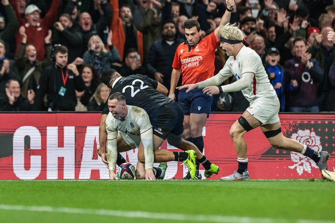 Tom Roebuck of England celebrates his try during the Quilter Nations Series 2025 match England vs New Zealand at Allianz Stadium, Twickenham, United Kingdom, 15th November 2025, Credit:Mark Cosgrove/News Images / Avalon