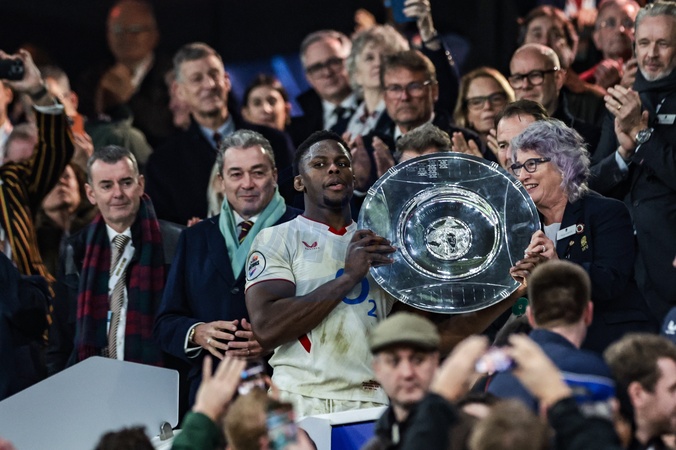 Mario Itoje of England lifts the Hillary Shield during the Quilter Nations Series 2025 match England vs New Zealand at Allianz Stadium, Twickenham, United Kingdom, 15th November 2025, Credit:Mark Cosgrove/News Images / Avalon