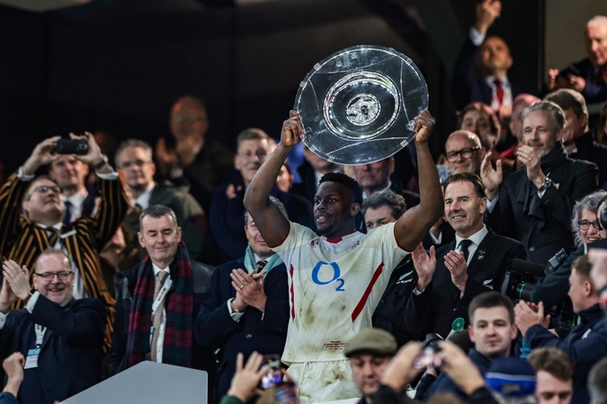 Mario Itoje of England lifts the Hillary Shield during the Quilter Nations Series 2025 match England vs New Zealand at Allianz Stadium, Twickenham, United Kingdom, 15th November 2025, Credit:Mark Cosgrove/News Images / Avalon