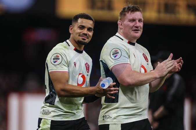 Ben Thomas and Rhys Carre of Wales applaud the fans at the final whistle during the Quilter Nations Series 2025 match Wales vs Japan at Principality Stadium, Cardiff, United Kingdom, 15th November 2025, Credit:Andrew Lewis/News Images / Avalon