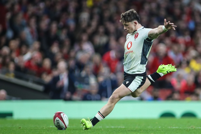 Dan Edwards of Wales kicks a conversion during the Quilter Nations Series 2025 match Wales vs Japan at Principality Stadium, Cardiff, United Kingdom, 15th November 2025, Credit:Andrew Lewis/News Images / Avalon