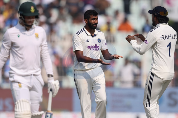 Jasprit Bumrah of India took the wicket of Corbin Bosch of South Africa and celebrates with KL Rahul of India during the IDFC First Bank Test Day 3 match India vs South Africa at Eden Gardens, Kolkata, India, 16th November 2025, Credit:Shubhajit Roy Karmakar/News Images / Avalon