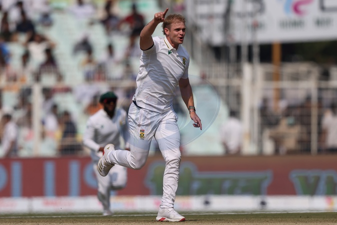 Corbin Bosch of South Africa celebrates after dismissing Dhruv Jurel of India during the IDFC First Bank Test Day 3 match India vs South Africa at Eden Gardens, Kolkata, India, 16th November 2025, Credit:Shubhajit Roy Karmakar/News Images / Avalon