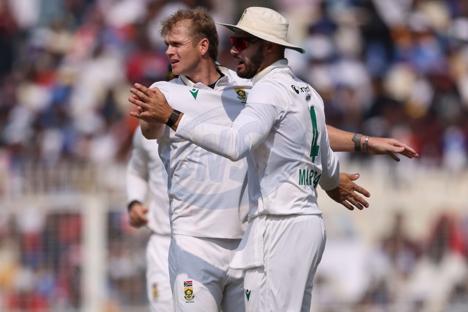 Corbin Bosch of South Africa celebrates with Aiden Markram of South Africa after dismissing Dhruv Jurel of India during the IDFC First Bank Test Day 3 match India vs South Africa at Eden Gardens, Kolkata, India, 16th November 2025, Credit:Shubhajit Roy Karmakar/News Images / Avalon