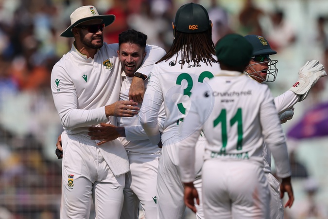 Simon Harmer of South Africa celebrates after taking wicket of Dhruv Jurel of India during the IDFC First Bank Test Day 3 match India vs South Africa at Eden Gardens, Kolkata, India, 16th November 2025, Credit:Shubhajit Roy Karmakar/News Images / Avalon