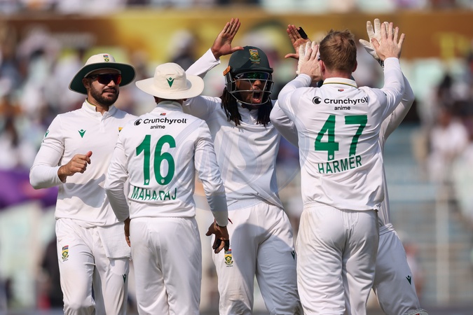 Simon Harmer of South Africa and Tony de Zorzi of South Africa during the IDFC First Bank Test Day 3 match India vs South Africa at Eden Gardens, Kolkata, India, 16th November 2025, Credit:Shubhajit Roy Karmakar/News Images / Avalon