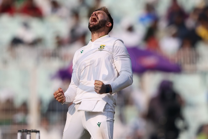 Aiden Markram of South Africa dismisses Washington Sundar of India and celebrates during the IDFC First Bank Test Day 3 match India vs South Africa at Eden Gardens, Kolkata, India, 16th November 2025, Credit:Shubhajit Roy Karmakar/News Images / Avalon