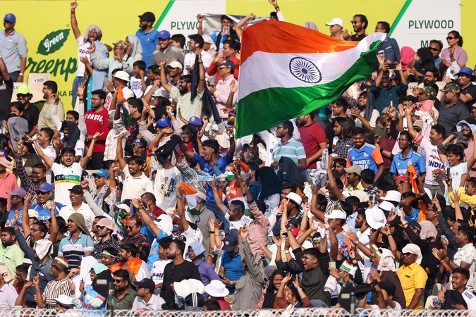 Indians fans celebrates after Axar Patel of India hits a massive six during the IDFC First Bank Test Day 3 match India vs South Africa at Eden Gardens, Kolkata, India, 16th November 2025, Credit:Shubhajit Roy Karmakar/News Images / Avalon
