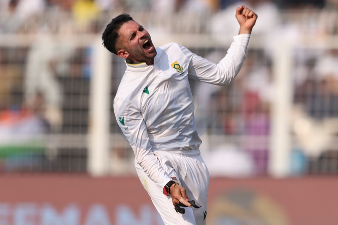 Keshav Maharaj of South Africa celebrates with Sisanda Magala of South Africa after dismissing Mohammed Siraj of India caught by Aiden Markram of South Africa South Africa win by 30 runs during the IDFC First Bank Test Day 3 match India vs South Africa at Eden Gardens, Kolkata, India, 16th November 2025, Credit:Shubhajit Roy Karmakar/News Images / Avalon