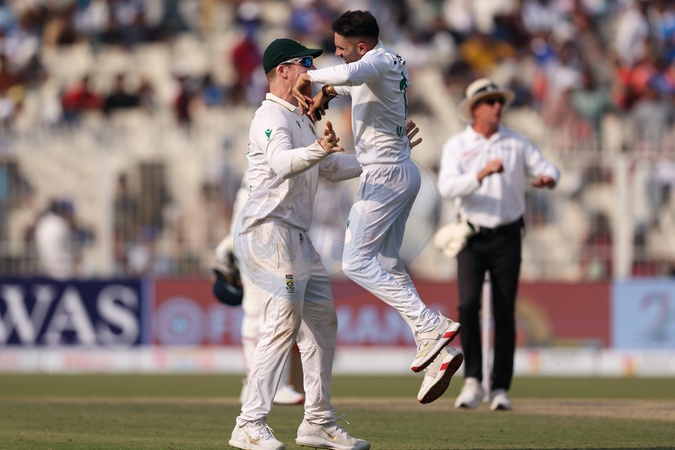 Keshav Maharaj of South Africa celebrates with Sisanda Magala of South Africa after dismissing Mohammed Siraj of India caught by Aiden Markram of South Africa South Africa win by 30 runs during the IDFC First Bank Test Day 3 match India vs South Africa at Eden Gardens, Kolkata, India, 16th November 2025, Credit:Shubhajit Roy Karmakar/News Images / Avalon