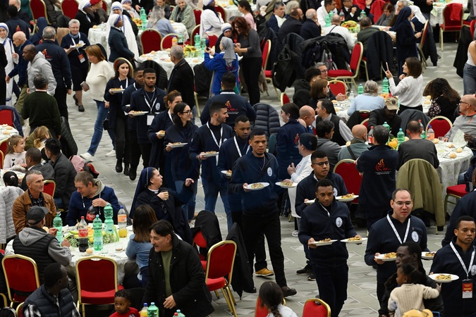 Pope Leo XIV attends a lunch with the poor on the occasion of the Jubilee of the Poor and the 9th World Day of the Poor inside the Paul VI Hall, Vatican City, 16 November 2025., Credit:Maria Laura Antonelli / Avalon